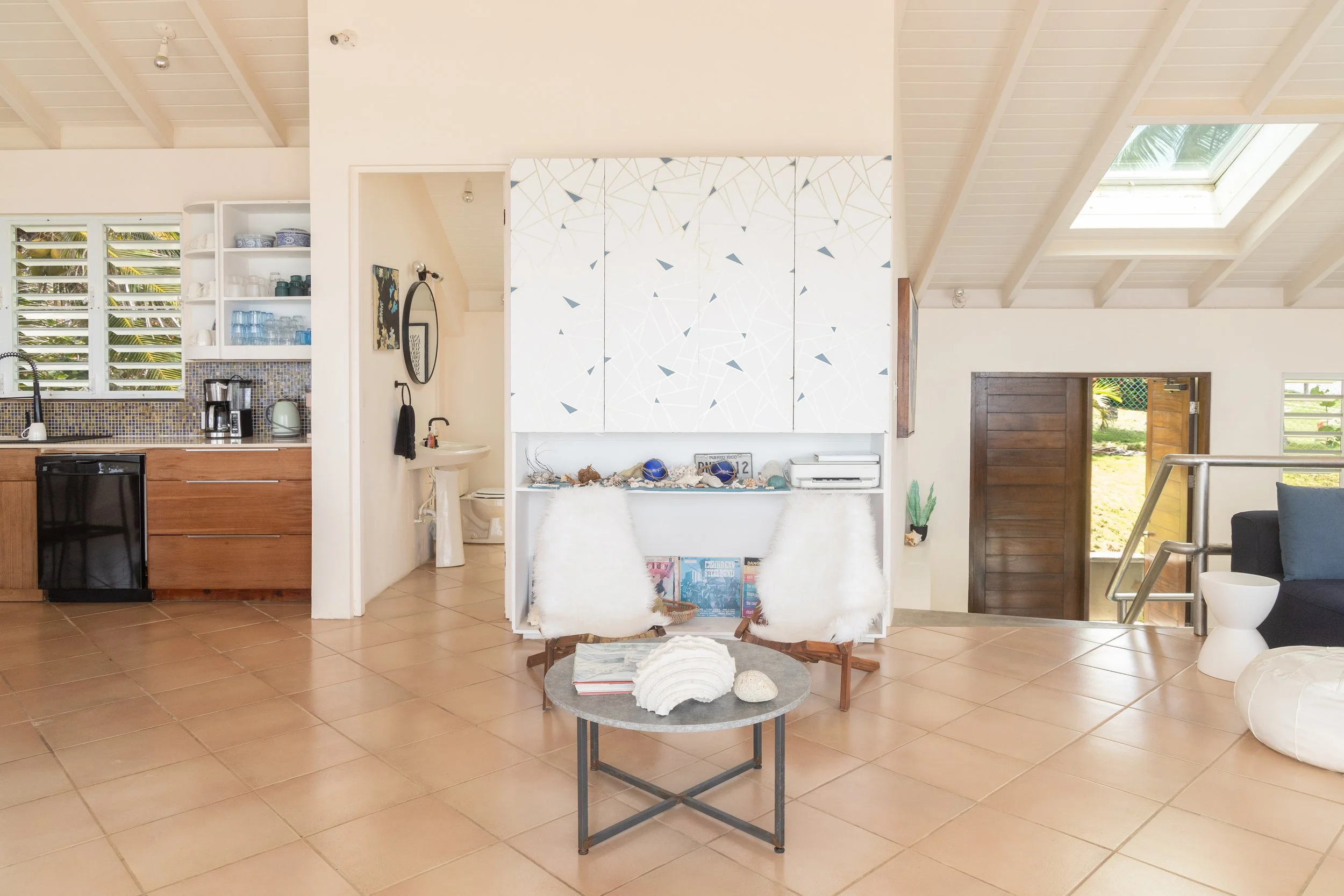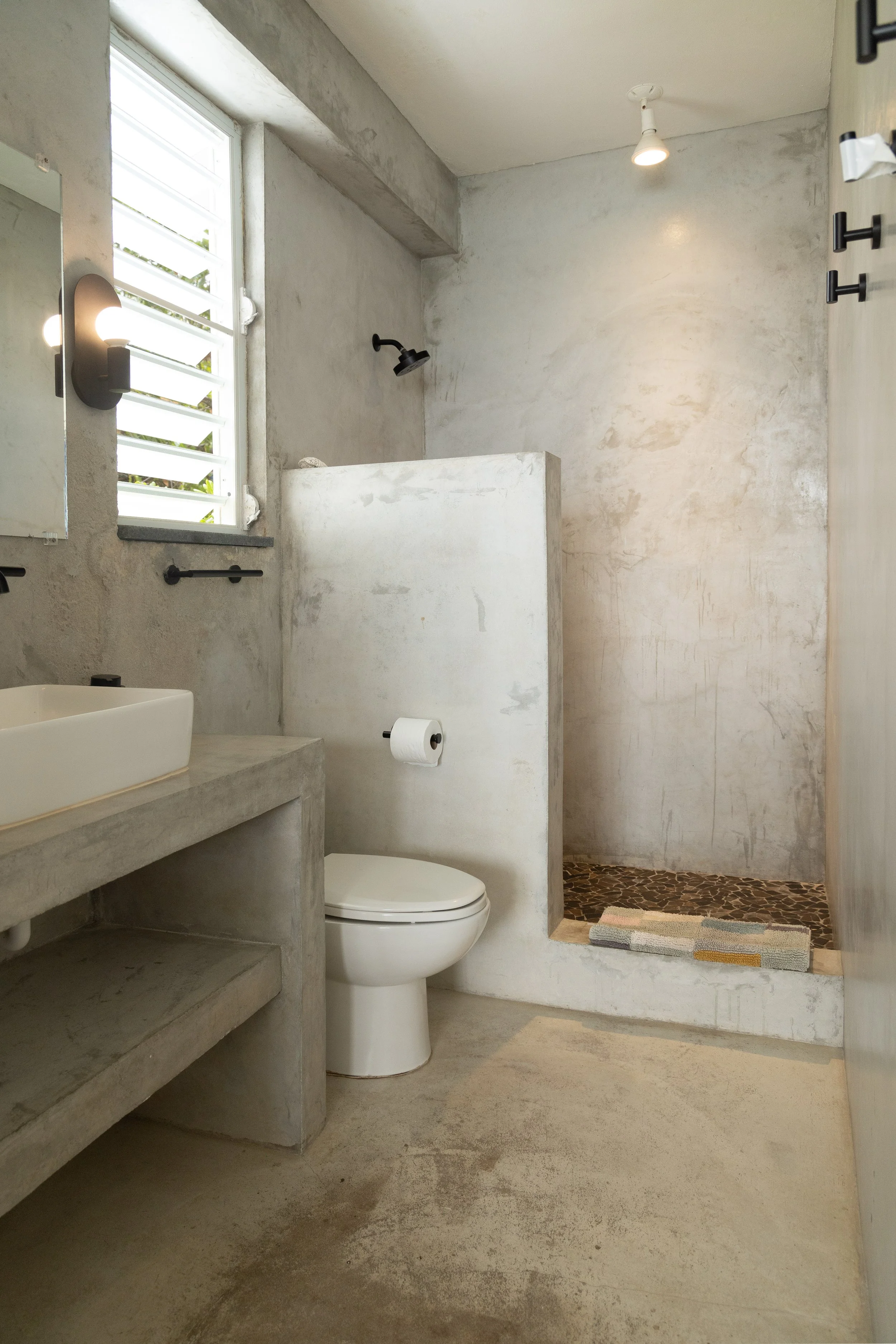 The ground floor offers two additional cozy, well-proportioned bedrooms and a common area with a reading nook. There’s also a modern full bathroom with a polished cement shower and built-in sink, positioned next to a large laundry and storage room. Beneath the pool deck is a utility and pump room, discreetly tucked away from the main living areas. The bedrooms are fully air-conditioned for comfort, while the rest of the home is designed to take full advantage of natural ventilation, ocean breezes, and crosswinds.