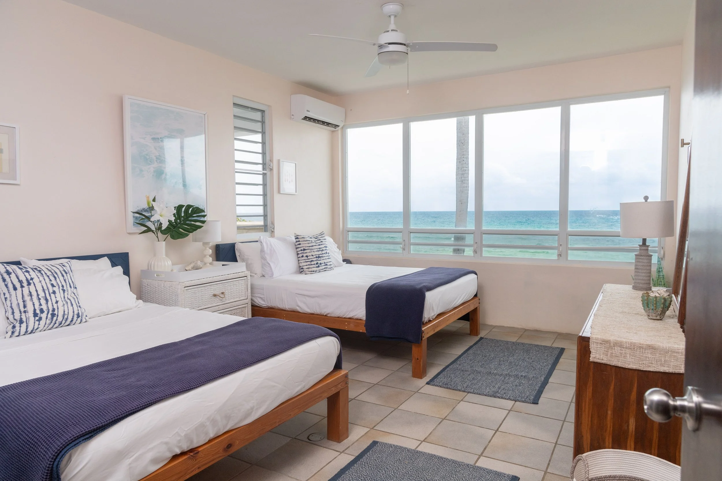 The upper level is the heart of the home, with vaulted ceilings and an open-concept kitchen, dining, and living area. Floor-to-ceiling windows and doors frame uninterrupted views of the ocean from nearly every angle. The living space opens onto a wide ocean-facing balcony, ideal for sun lounging or outdoor dining. A half bath and an adjacent auxiliary room—currently outfitted with a bed—offer potential for a flexible use space or an additional bathroom conversion.