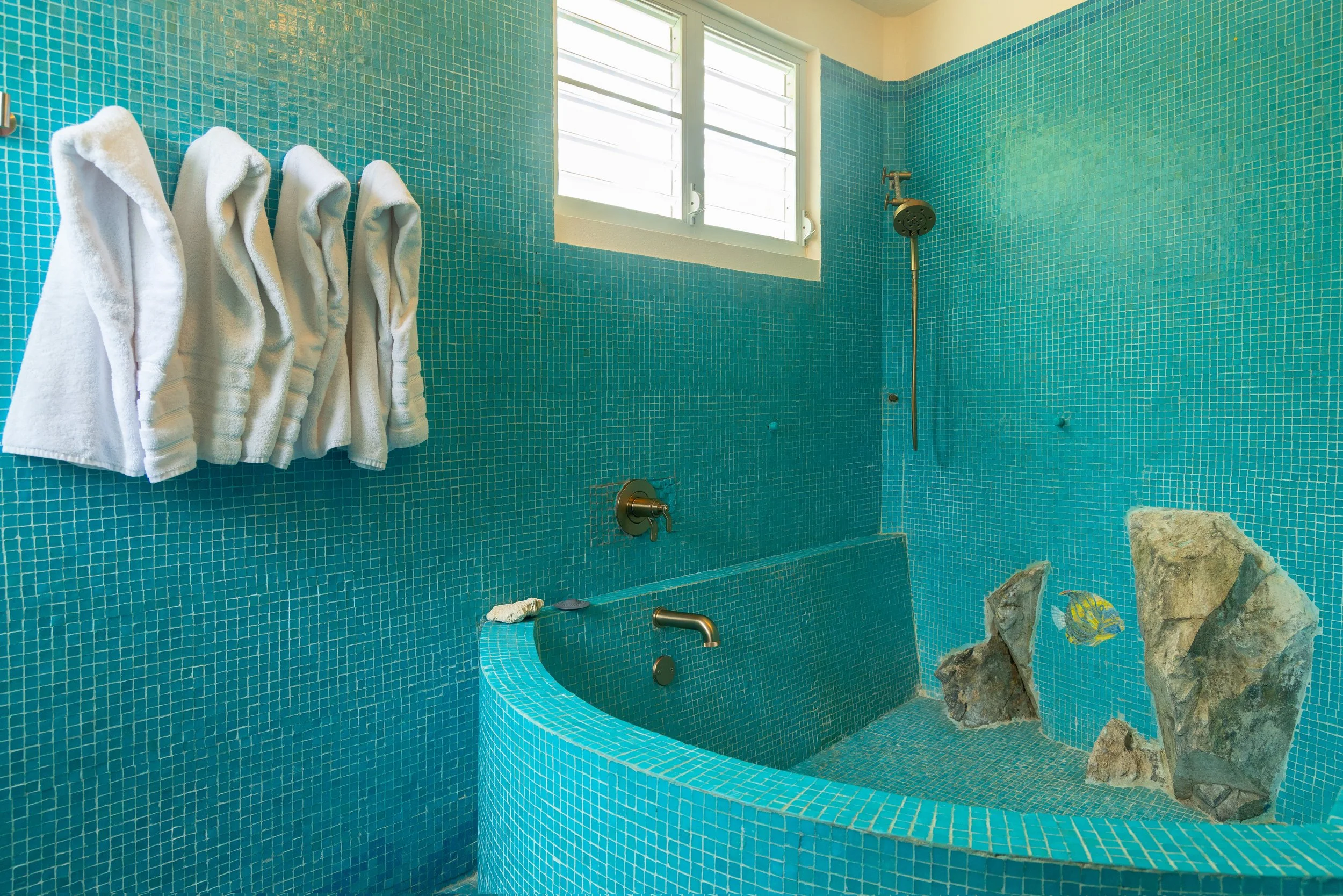 Anchoring the structure is a central staircase built directly into the landscape, incorporating large natural boulders that not only define the aesthetic but also act as part of the home’s foundation. The second level houses the primary sleeping quarters, including two ocean-view bedrooms. The principal suite includes a modern ensuite bath with a polished cement shower and integrated sink. This level also features a smaller sitting room with a hidden Murphy bed, which opens onto a balcony overlooking the sea and connecting to the pool terrace. A spacious second full bath includes an oversized built-in tiled tub.