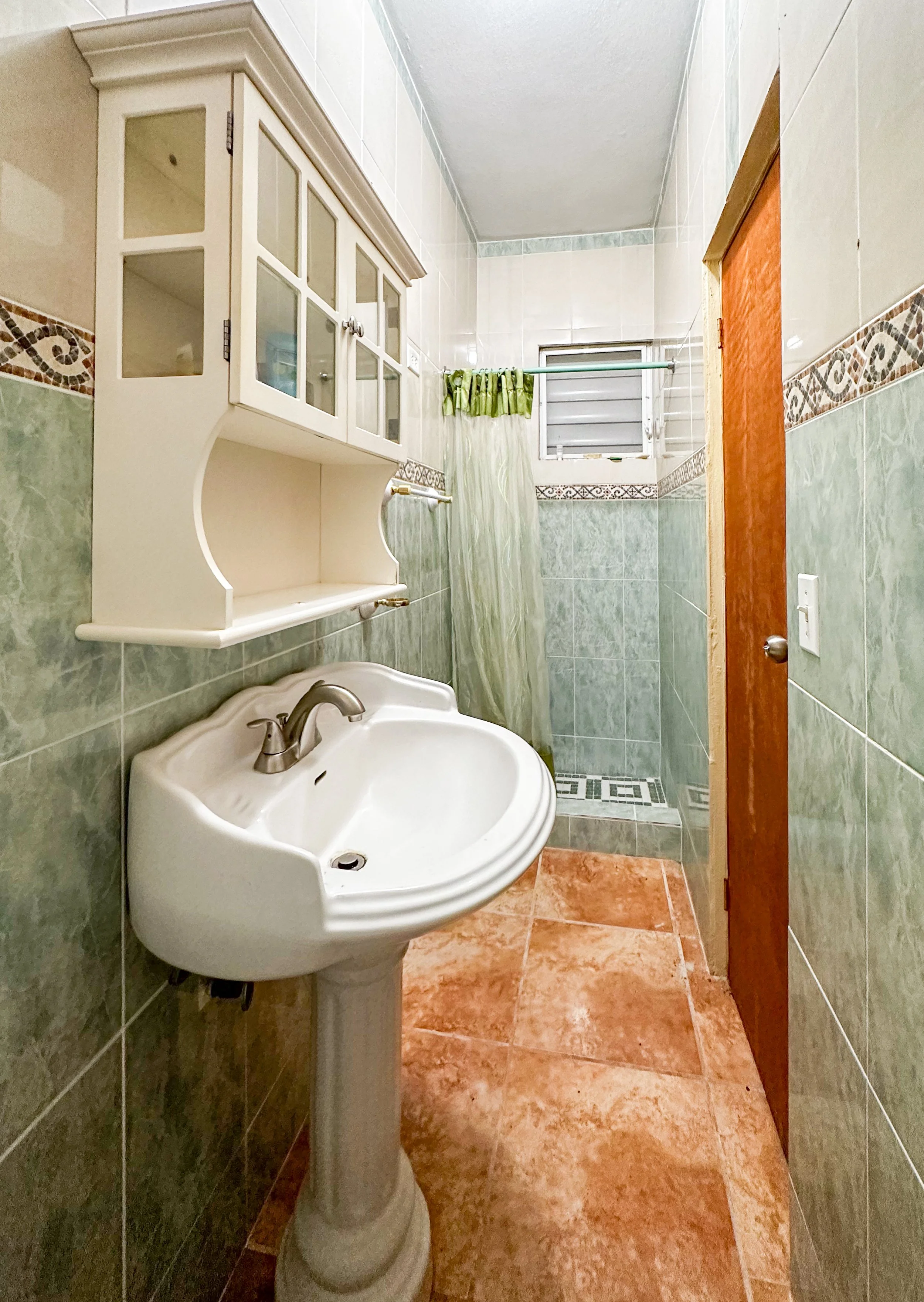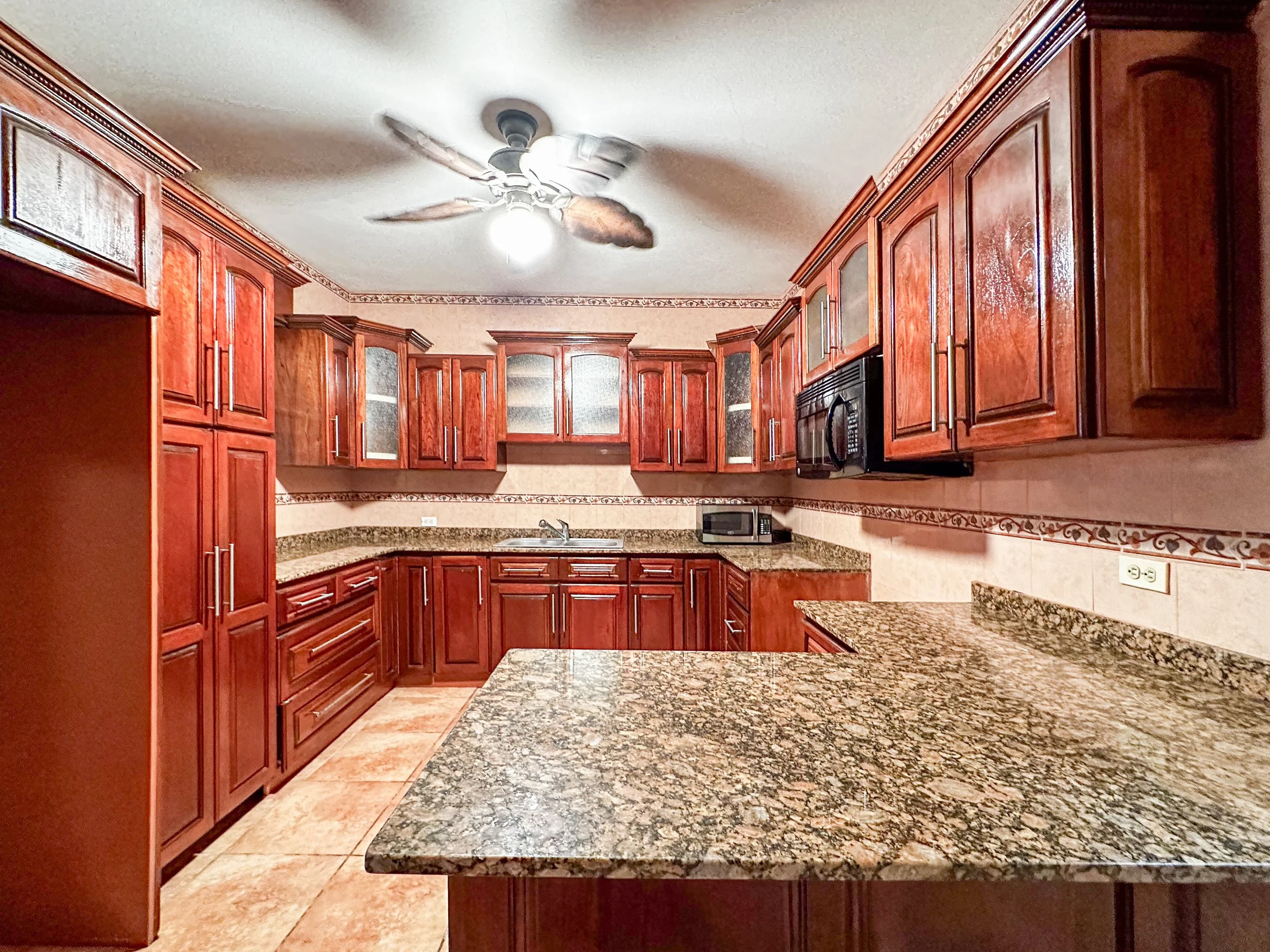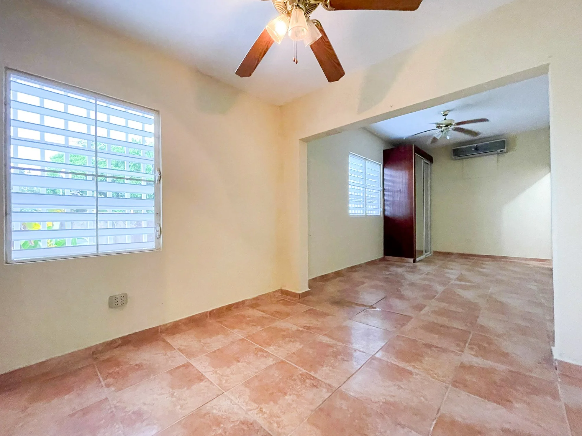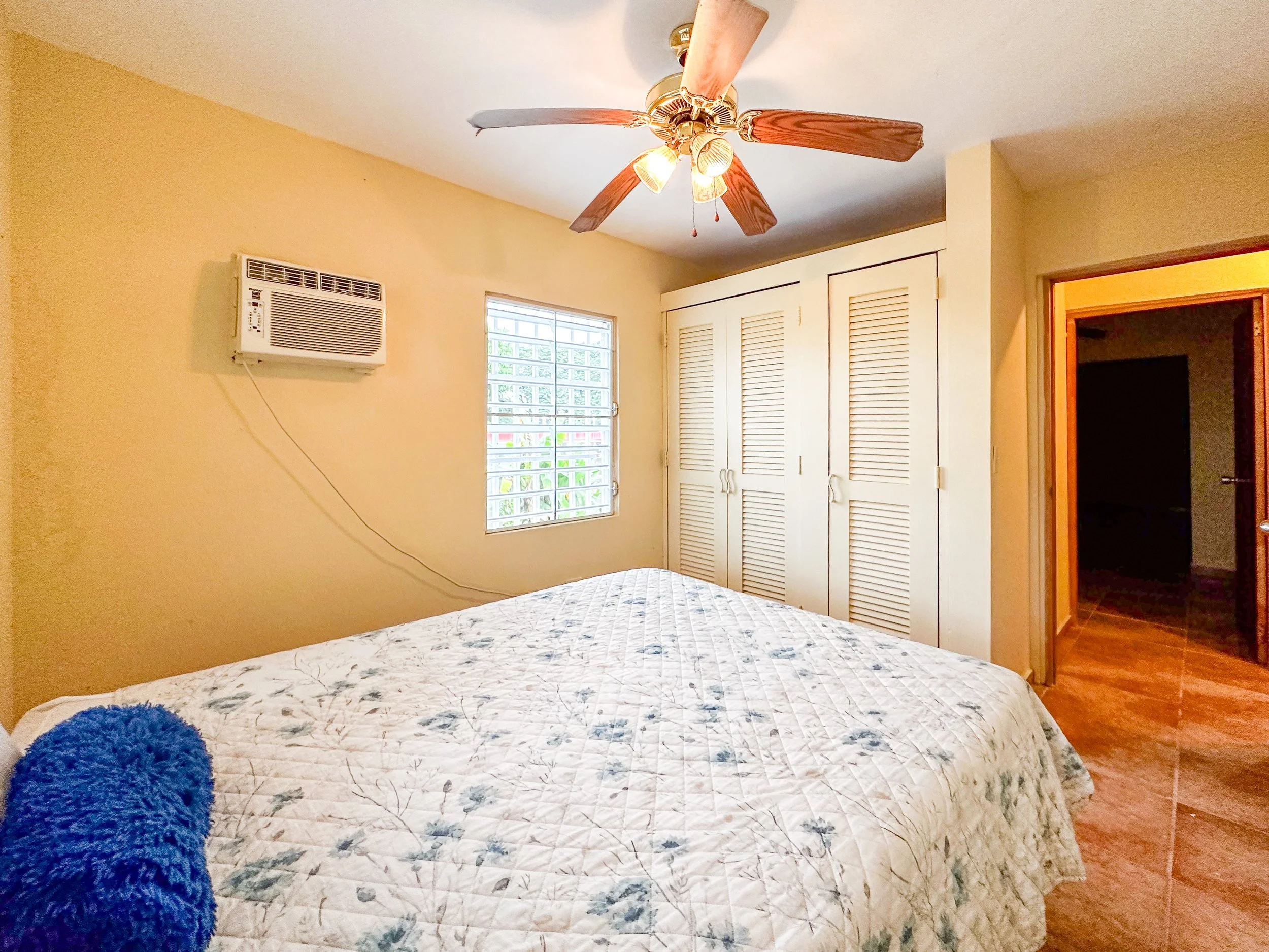 Inside this functional home, the ample great room is large enough for a living and dining area and is fitted with new fans, ceramic tiles, louvered windows and stain glass doors. The traditional kitchen has solid wood cabinets, granite counters, a large pantry and an area for bar seating. Its principal bedroom has an en-suite bathroom and space for a sitting area. Two additional guest bedrooms in the main quarters share a guest bathroom. A separate bedroom towards the rear has it’s own private entrance and en-suite bathroom, so guests can have privacy if desired. All the bedrooms have built in closets and AC.
