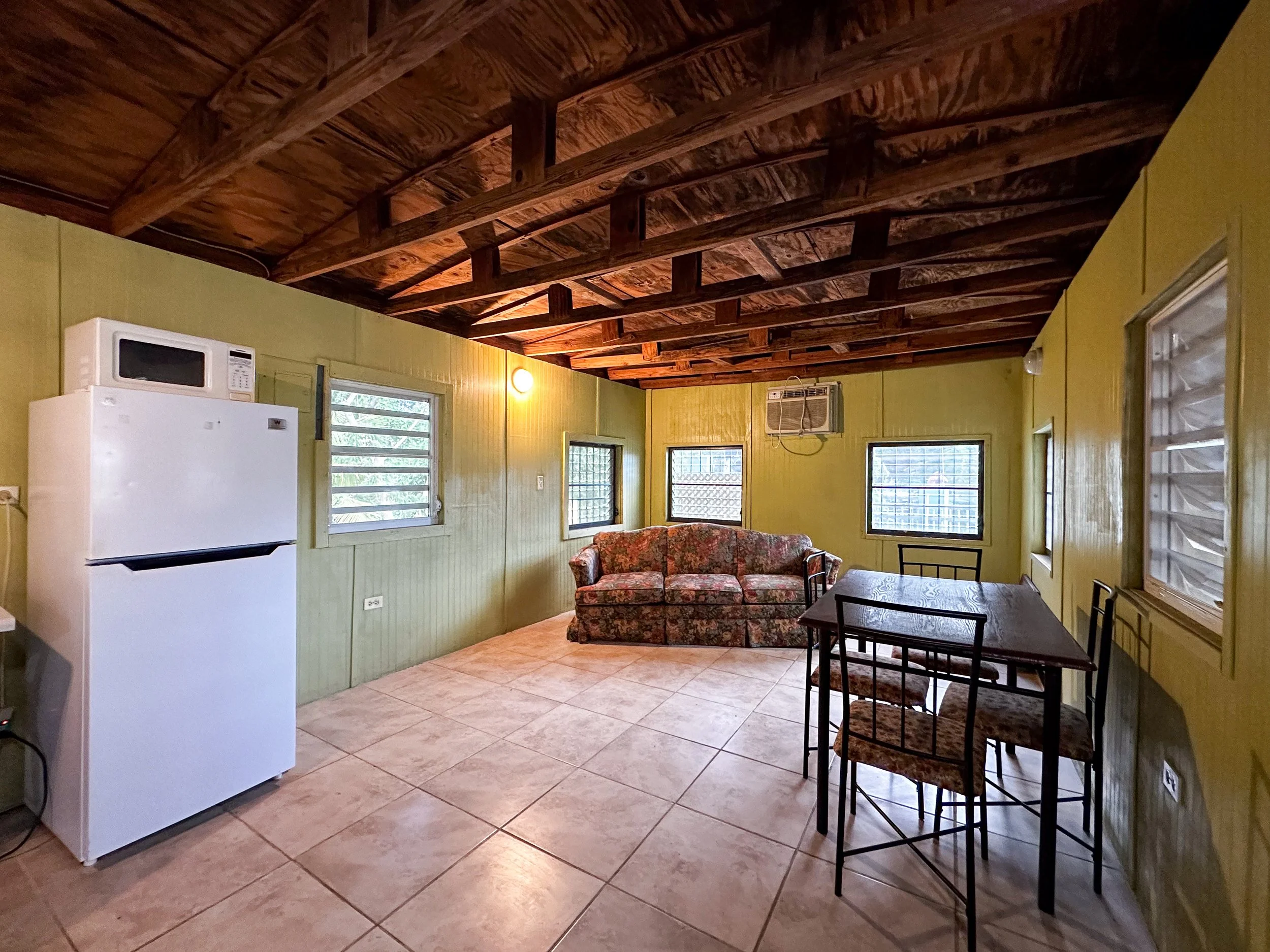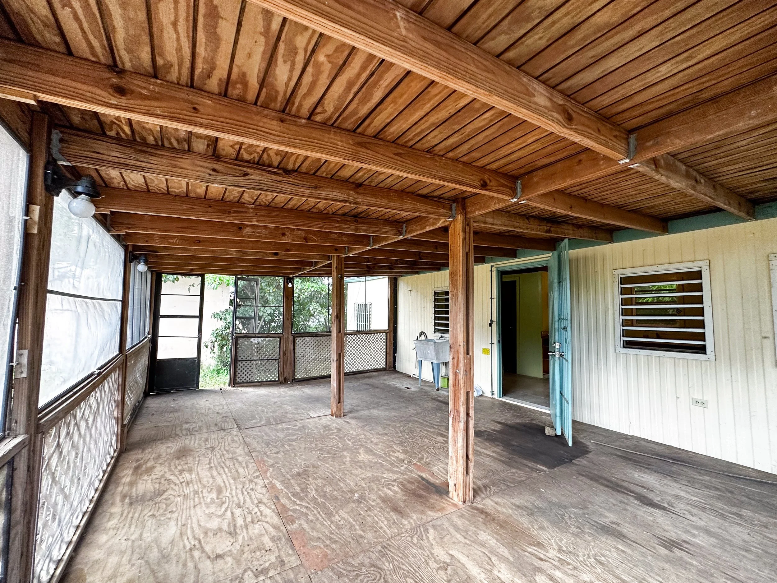 While its size makes it easy to maintain, the property is open and sits on a corner lot making the grounds feel spacious. The screened in porch is an awesome area to hang out, hang a hammock, or create a sun room filled with potted plants. The semi-furnished interiors have an open kitchen with working appliances, a large living/dining area and a comfortably sized bedroom. The bunglow has a metal roof, tiled floors, is anchored down (survived Hurricane María), and is connected to public water and electric, providing peace of mind and convenience, all at a great price!