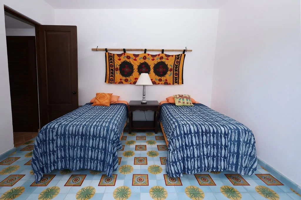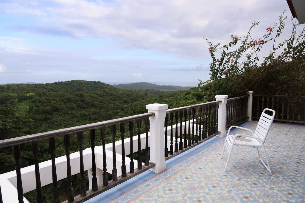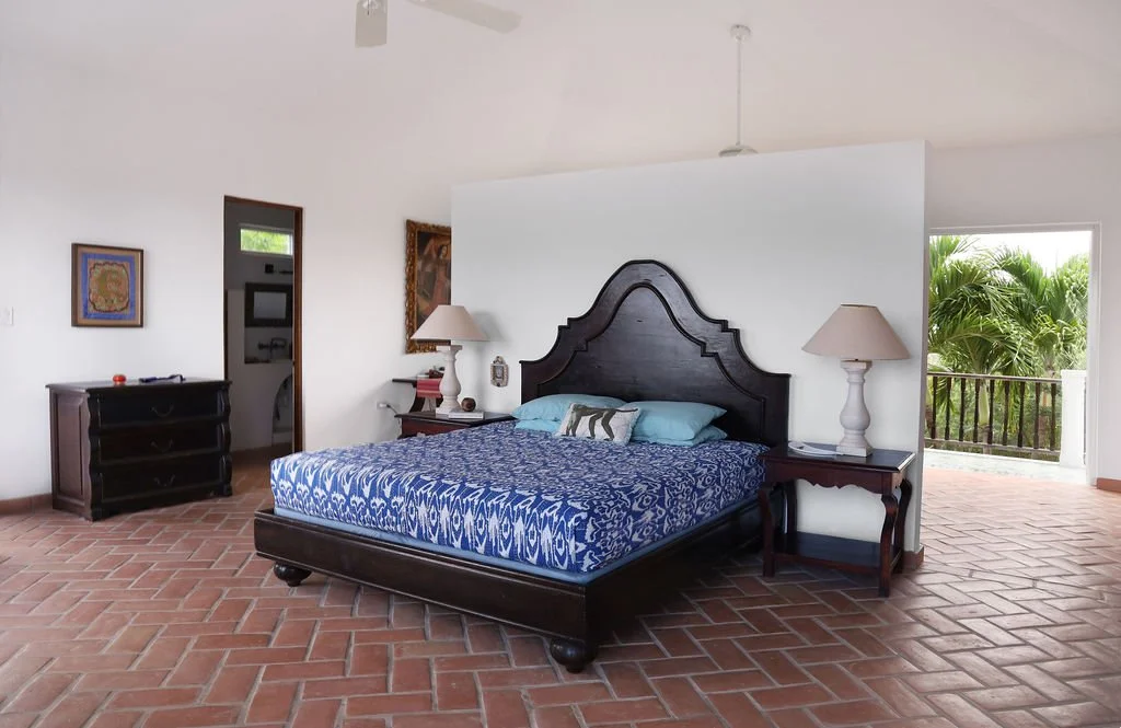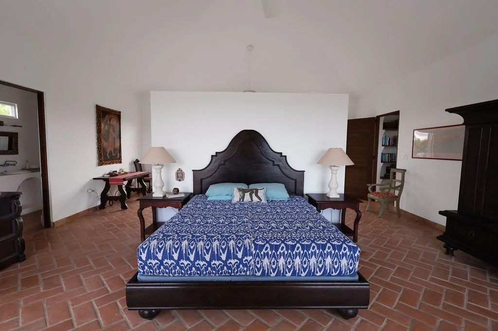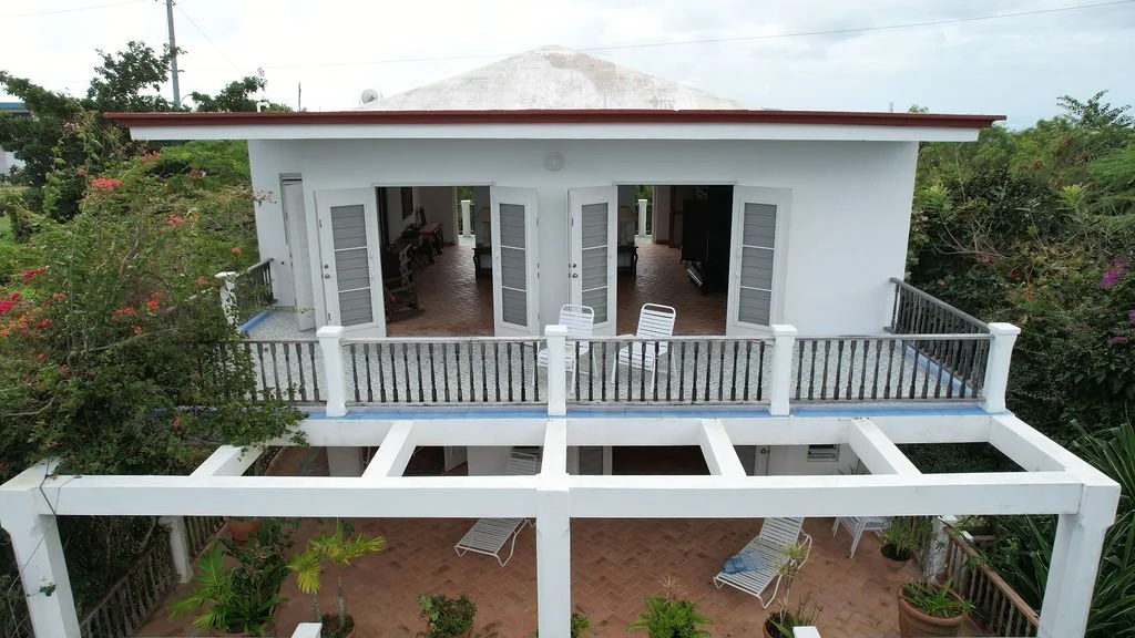 The upper level is reached via colorfully tiled steps, leading to a magnificent open space with soaring vaulted cement ceilings. This versatile area offers a lounge/work space, perfectly positioned to enjoy stunning views to the north of Vieques, Puerto Rico, and dramatic sunsets over the horizon. Adjacent is the master suite, featuring handcrafted solid wood furniture, a private balcony offering soothing breezes, and 180-degree views of the Eastern sky, where you can watch mesmerizing sunrises each morning. The luxurious master bath includes ample storage and an owner’s closet for added convenience.