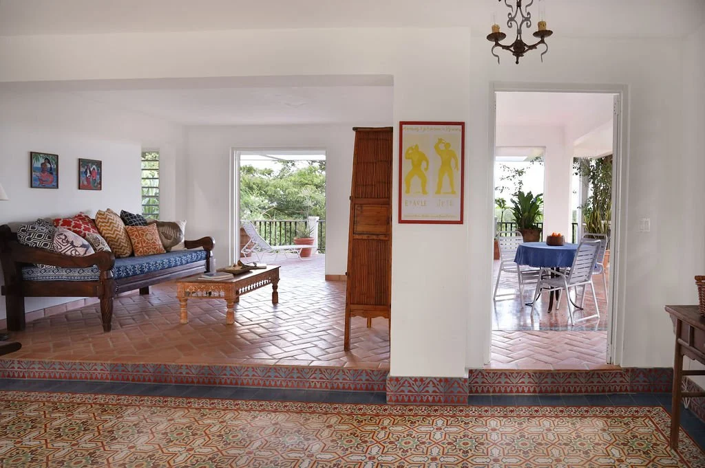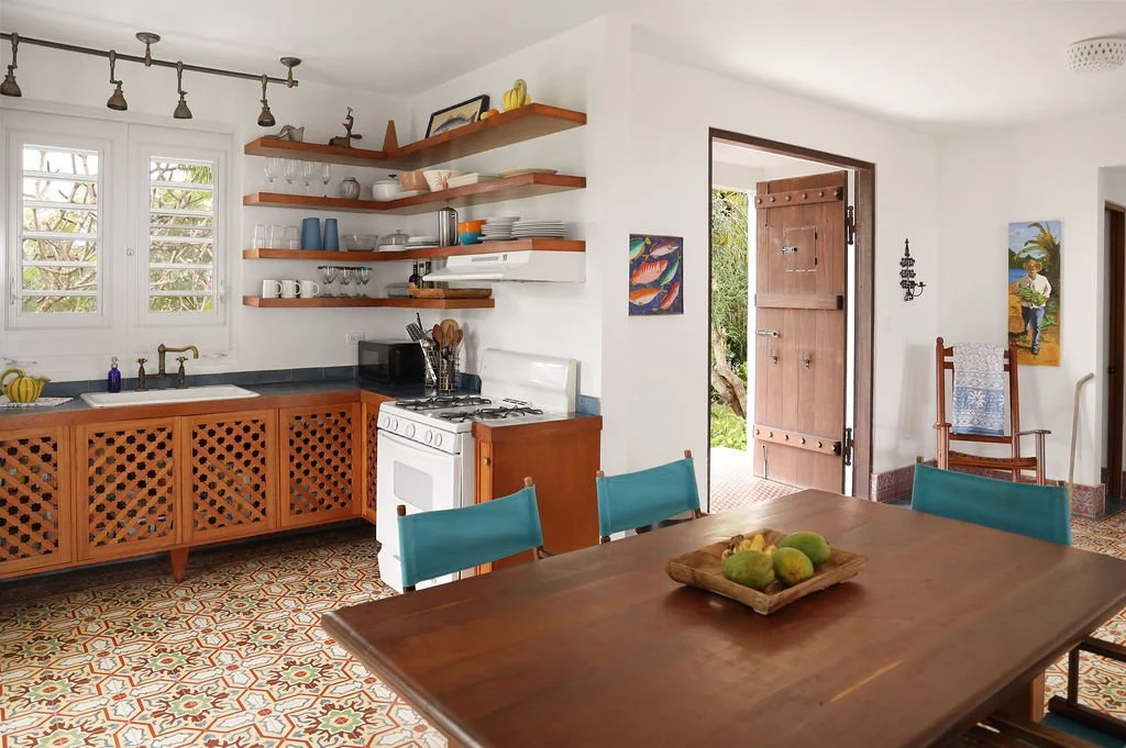 The property features imported Spanish cement tiles and Mexican Saltillo throughout, enhancing the warmth and charm of the space. Classic white exteriors with terracotta accents, complemented by a charming wooden veranda, reflect the timeless elegance of Mediterranean inspired design.
